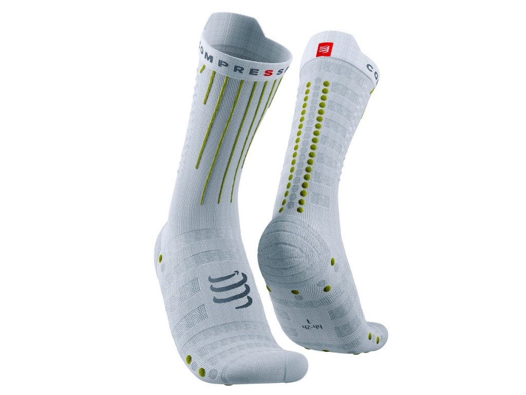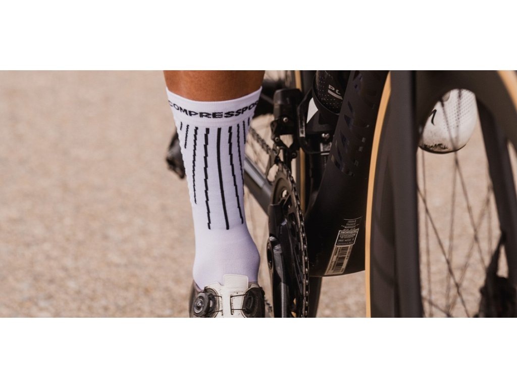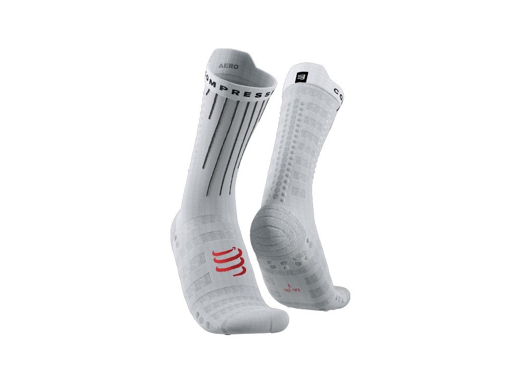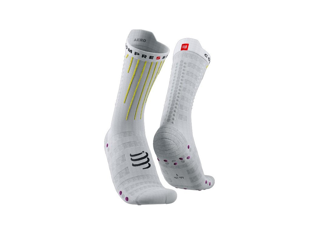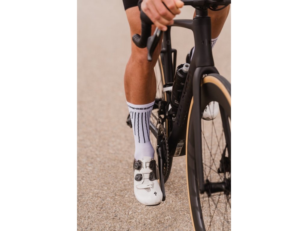 Ultralehká, maximálně prodyšná aero ponožka s vysokým střihem, která vám pomůže stlačit čas v cyklistické části triatlonového závodu. Ultralehká, maximálně prodyšná aero ponožka s vysokým střihem, která vám pomůže stlačit čas v cyklistické části triatlonového závodu. Hlavním aspektem těchto ponožek jsou aerodynamické linie v přední části, které byly testovány v aerodynamickém tunelu. Ikonické výstupky jsou zde zastoupeny i novými AERO-DOTS, které jsou navrženy od kotníku až k hornímu lemu ponožky za účelem snížení turbulencí a odporu v zadní části ponožky. Ušetříte tak několik dalších wattů. Struktura chodidlové části kopíruje běžecký ultralightový model. Lehká, technická síťovina je navržena tak, aby seděla doslova jako druhá kůže na vaší noze. Tyto ponožky nabízí výjimečnou ventilaci a velmi rychle odvádí pot a vlhkost od chodidla. Zcela nová špička nabízí ergonomičtější přizpůsobení vašim prstům i vylepšenou propriocepci, což umožní prstům intuitivní polohu při dopadu pro plynulý, přirozený krok. Oblast palce je navíc obohacena froté vycpávkou. Vylepšená podpora klenby je samozřejmostí. Nejen že podporuje mikrocirkulaci, ale především zabraňuje kroucení ponožky uvnitř boty. Ponožka tak zůstane přesně na svém místě a zároveň předchází vzniku puchýřů a nepříjemných otlačenin. V zadní části ponožky se ultratenká síťovina stará o co nejlepší prodyšnost. V oblasti Achillovy šlachy jsou navrženy dva pruhy výstupků 3D-DOTS pro maximální podporu při cyklistice i běhu. Střih aero ponožek je ještě vyšší než u trialového modelu pro optimální aerodynamický výkon. Avšak při zachování limitů mezinárodní cyklistické unie UCI. Vrchní lem má po svém vnitřním obvodu navržena silikonová kolečka pro zachování své polohy i při běhu.Doplňkové parametry