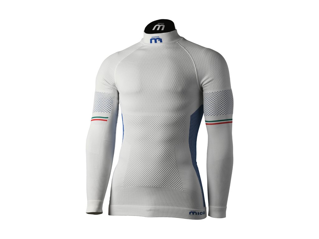Bezešvé zimní dlouhé termo prádlo Mico LONG SLEEVES MOCK NECK SHIRT M1, vrchol technické inovace a výzkumu výkonnosti. Vysoká prodyšnost a termoregulace tvořená dvou-komponentní technologií, která kombinuje hydrofóbní tkaninu Drayrn uvnitř a hydrofilní hi-tech polyamid z vnější strany pro maximální odvod vlhkosti. Konstrukční strukturu mapující celé tělo tvoří ergonomické ochranné zóny na ramenou, podpora posturálních svalů lopatek, účinné vypařování podél zad a v podpaží, elastická podpora s vysokou hustotou po stranách a na hrudi a mírná komprese na konci rukávů.Doplňkové parametry