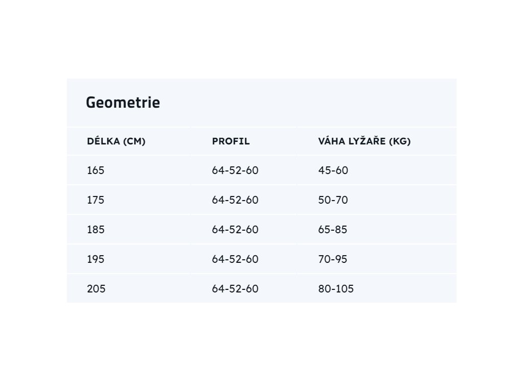 Širší backcountry lyže pro náročný terén. Díky ocelovým hranám si poradí s ledem i hlubokým sněhem. Sendvič dřevěného jádra složeného z mnoha lamel výběrovéhPovedená lyže s profilem umožňující se vydat kam vás napadne. Sendvič dřevěného jádra složeného z mnoha lamel výběrového dřeva. Díky ocelovým hranám zvládne zledovatělý terén, vejde se i do stopy. O pevnost se starají vrstvy sklolaminátů. Jeďte tam, kde nebyl nikdo před vámi. Lyže se vyrábí s lisovaným protismykem. Váha jednoho páru lyží je 2033 g (195 cm). Povedená lyže s profilem umožňující se vydat kam vás napadne. Sendvič dřevěného jádra složeného z mnoha lamel výběrového dřeva. Díky ocelovým hranám zvládne zledovatělý terén, vejde se i do stopy. O pevnost se starají vrstvy sklolaminátů. Jeďte tam, kde nebyl nikdo před vámi. Lyže se vyrábí s lisovaným protismykem. Váha jednoho páru lyží je 2033 g (195 cm). SKLUZNICE Lisovaný protismyk VELIKOSTNÍ/VÁHOVÁ TABULKA VELIKOSTNÍ/VÁHOVÁ TABULKADoplňkové parametry