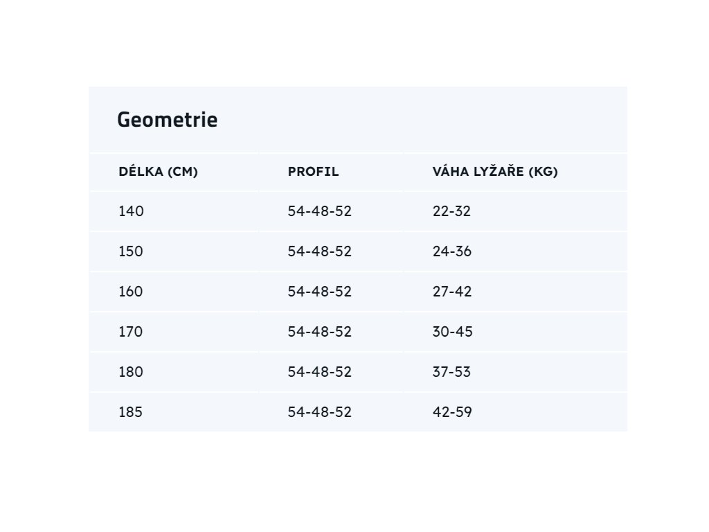 Snadno ovladatelné kvalitní běžky pro juniory, které s lehkostí zvládnou sportovní tempo. Lyže s hladkou extrudovanou skluznicí určená pro mazání. V případě výběru vázání k těmto lyžím doporučujeme od délky 140 cm zvolit Prolink Auto. Snadno ovladatelné kvalitní běžky, které s lehkostí zvládnou sportovní tempo. Lyže se vyrábí ve verzi řezaným protismykem. Geometrie DÉLKA (CM) PROFIL VÁHA LYŽAŘE (KG) 140 54-48-52 22-32 150 54-48-52 24-36 160 54-48-52 27-42 170 54-48-52 35-50 180 54-48-52 45-65 185 54-48-52 50-70 VELIKOSTNÍ/VÁHOVÁ TABULKADoplňkové parametry