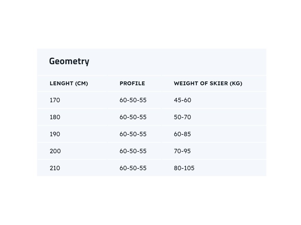 Povedená lyže s profilem umožňující se vydat kam vás napadne. Sendvič dřevěného jádra složeného z mnoha lamel výběrového dřeva. Díky ocelovým hranám zvládne zledovatělý terén, vejde se i do stopy. O pevnost se starají vrstvy sklolaminátů. Lyže se vyrábí ve verzi s lisovaným protismykem. Jeďte tam, kde nebyl nikdo před vámi. Váha jednoho páru lyží je 2000 g (190 cm). Povedená lyže s profilem umožňující se vydat kam vás napadne. Sendvič dřevěného jádra složeného z mnoha lamel výběrového dřeva. Díky ocelovým hranám zvládne zledovatělý terén, vejde se i do stopy. O pevnost se starají vrstvy sklolaminátů. Lyže se vyrábí ve verzi s lisovaným protismykem. Jeďte tam, kde nebyl nikdo před vámi. Váha jednoho páru lyží je 2000 g (190 cm). VELIKOSTNÍ/VÁHOVÁ TABULKADoplňkové parametry