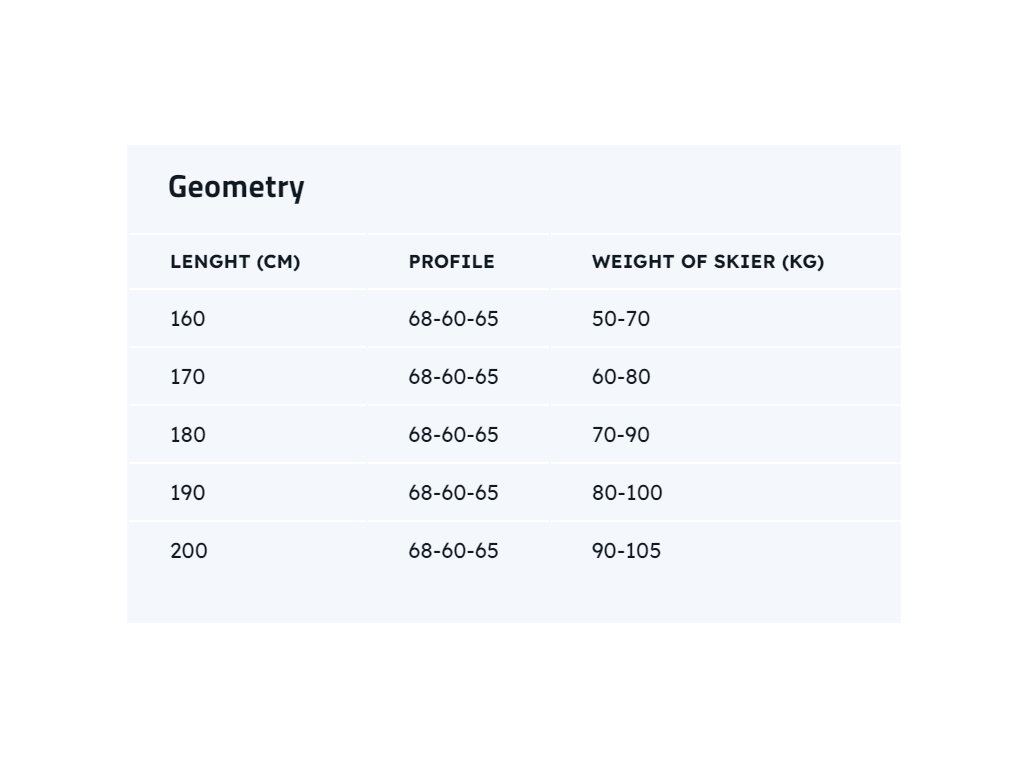 Širší backcountry lyže pro náročný terén. Díky ocelovým hranám si poradí s ledem i hlubokým sněhem. Sendvič dřevěného jádra složeného z mnoha lamel výběrového dřeva. O pevnost se starají vrstvy sklolaminátů. Spolehlivý společník do těžkých podmínek. Tyto lyže dobyly i Severní pól. Lyže se vyrábí ve verzi s lisovaným protismykem. Váha jednoho páru lyží je 2233 g (190 cm). Širší backcountry lyže pro náročný terén. Díky ocelovým hranám si poradí s ledem i hlubokým sněhem. Sendvič dřevěného jádra složeného z mnoha lamel výběrového dřeva. O pevnost se starají vrstvy sklolaminátů. Spolehlivý společník do těžkých podmínek. Tyto lyže dobyly i Severní pól. Lyže se vyrábí ve verzi s lisovaným protismykem. Váha jednoho páru lyží je 2233 g (190 cm). SKLUZNICE Lisovaný protismyk VELIKOSTNÍ/VÁHOVÁ TABULKADoplňkové parametry