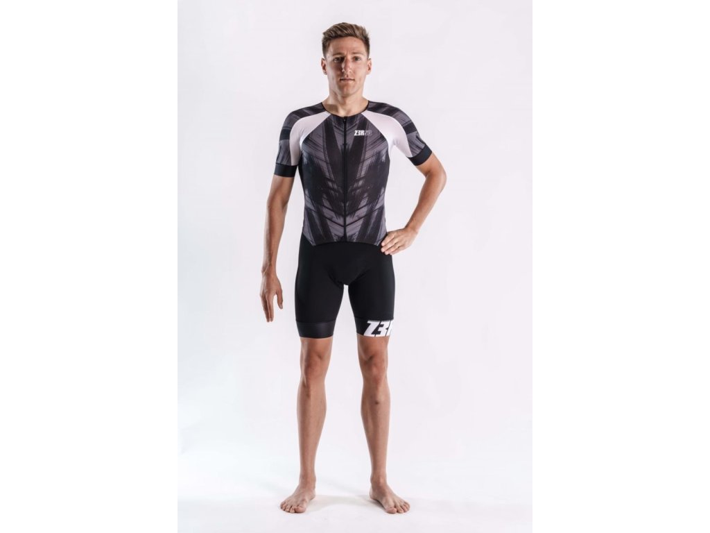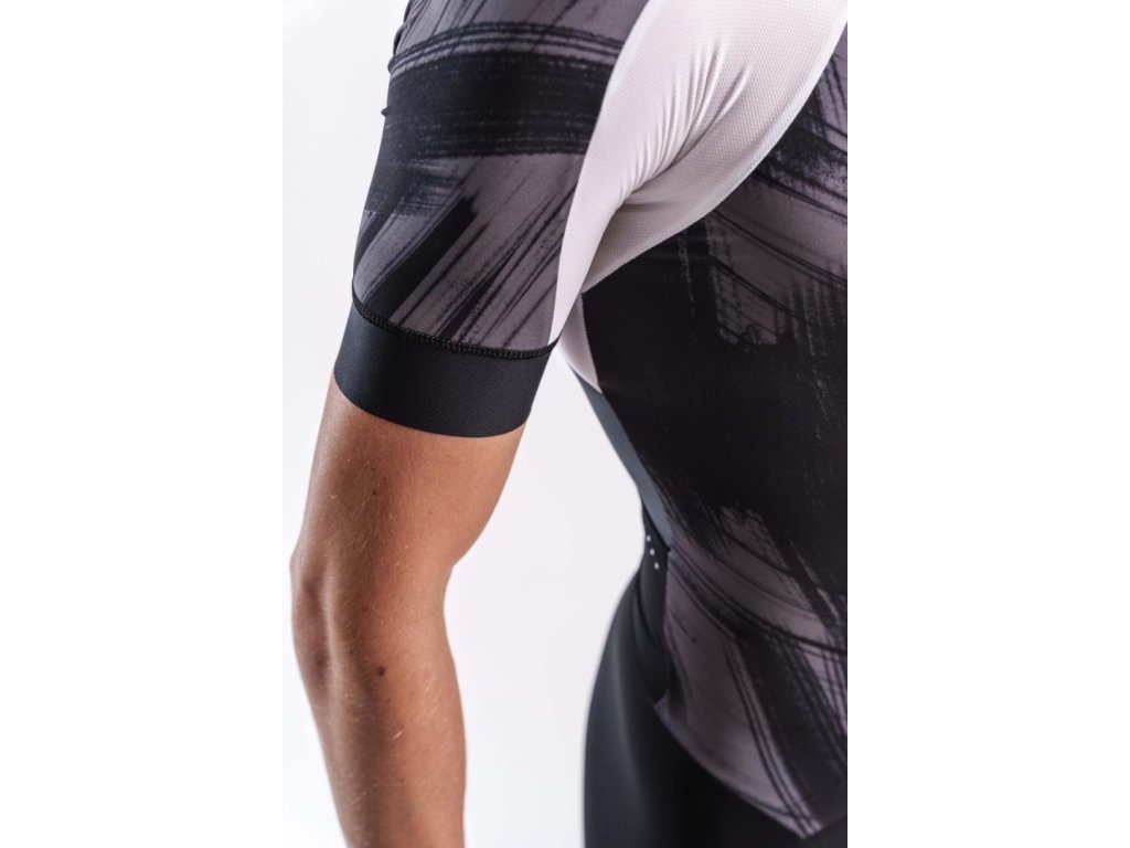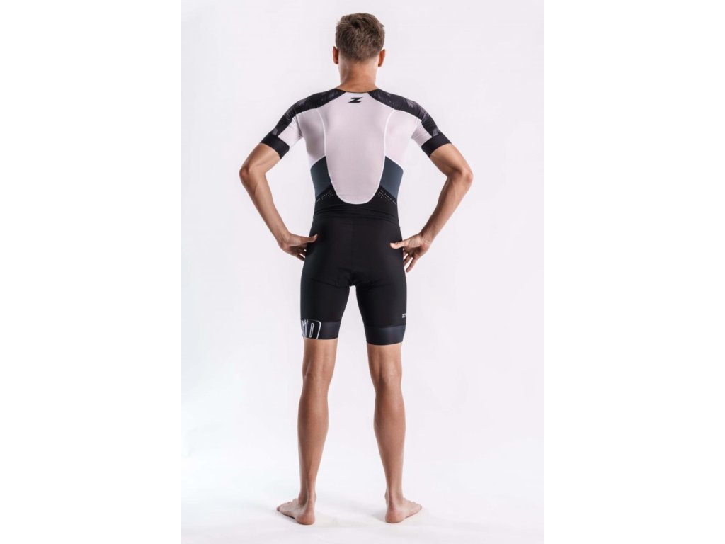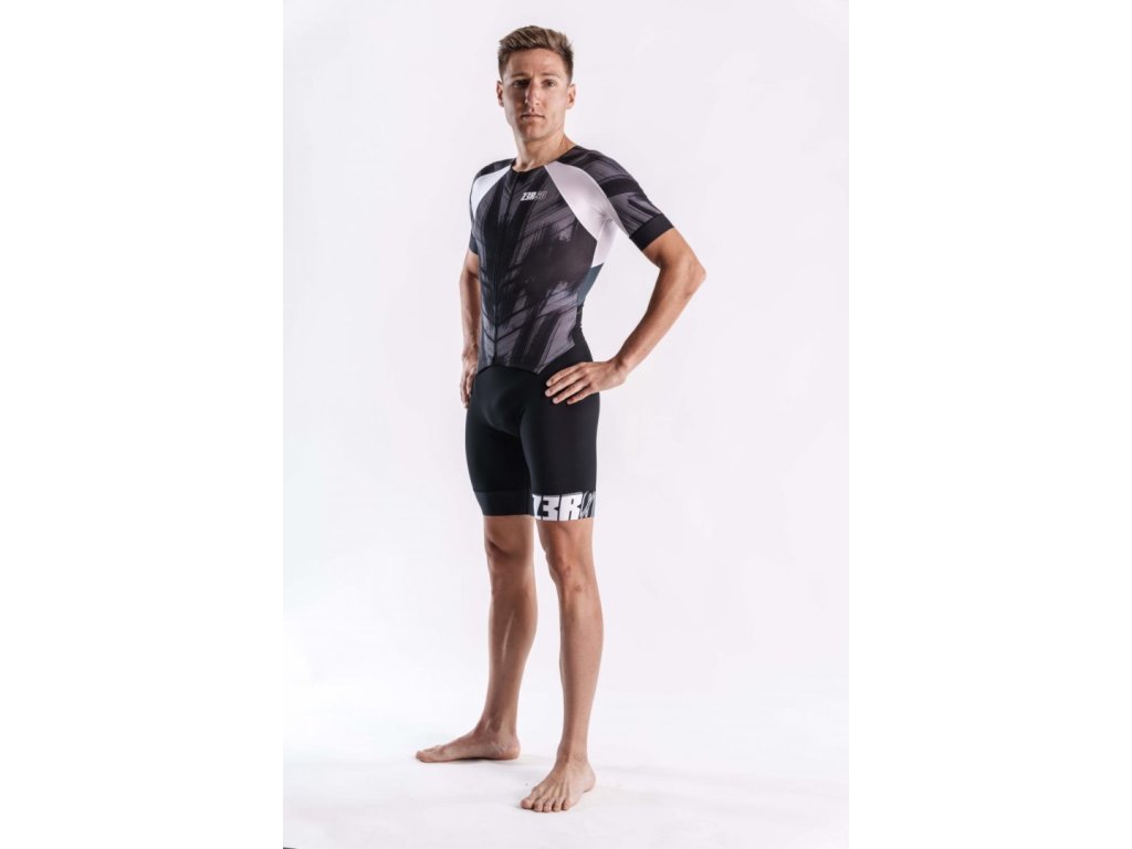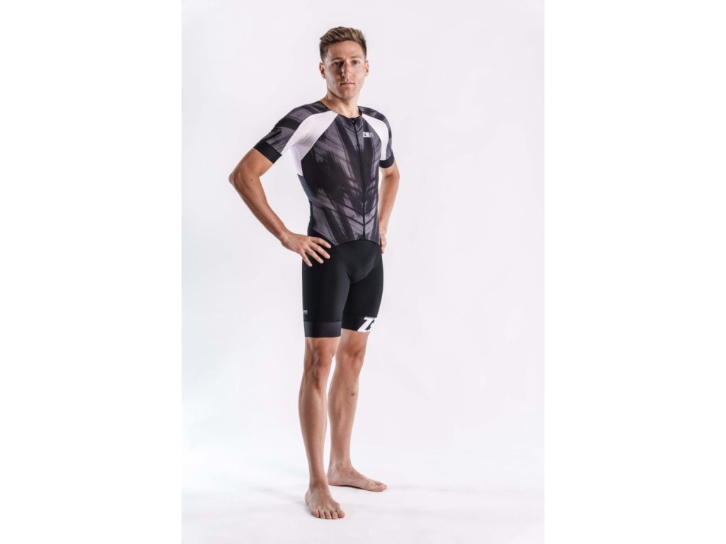 Pánská triatlonová kombinéza s krátkým rukávem. Dres TTSUIT řady Racer byl navržen pro triatlonisty závodící na delších vzdálenostech. Svršek byl navržen ve vestovém stylu, což spolu s ultralehkou a elastickou tkaninou znatelně ulehčuje oblékání a svlékání dresu. Zip a grip na spodním lemu navíc zajistí, že dres zůstane na správném místě po celou dobu závodu. Dres je vhodný pro podávání těch nejvyšších triatlonových výkonů. Byl speciálně navržen pro zvýšení aerodynamické efektivity, což pocítíte především při závodě. Svršek disponuje krátkým rukávem překrývajícím biceps, čímž ho chrání před vnějšími vlivy jako je déšť nebo vítr. Přidáním rukávu je navíc dosaženo daleko lepší aerodynamiky v porovnání s nahou kůží, což zajisté oceníte v cyklistické části triatlonu. V oblasti ramenou a paží je dres vyroben z tkaniny Ultra Light Skin, která zajišťuje pohodlí, zatímco materiál Dry Tech Mesh na zádech dokonale odvádí pot, ventiluje a udržuje kůži v suchu a teple. Nová technologie Revo Comp poskytuje nohám perfektní svalovou podporu a maximální volnost pohybu. Díky anatomicky střiženým panelům na bocích dres velmi dobře padne. Dvě anatomicky střižené kapsy v zadní části dresu Vám umožní si sebou vzít energetické doplňky a zároveň nenaruší Vaši aerodynamiku. Technické parametry: - 40cm zip pro ultra rychlé oblékání a lepší pohyblivost. Dvojité šití z vnitřní strany zaručuje maximální odolnost a pohodlí, nechybí ani funkce stop-lock, díky které zůstane jezdec ve Vámi nastavené pozici; - jemný lem okolo krku a rukávů pro zlepšení aerodynamiky a maximální komfort; - silikonový lem na nohavicích udrží dres na správném místě při cyklistické části závodu; - ochrana proti slunci díky tkanině Water Wear Weapon: UPF50+; - semišový tripad s gelem uvnitř je rychleschnoucí, extrémně elastický, antibakteriální a zároveň velmi efektivní pro jízdu na kole a pohodlný při běhu. Složení: 80 % polyamid, 20 % elastan. Vyrobeno v Portugalsku. TABULKA VELIKOSTÍDoplňkové parametry