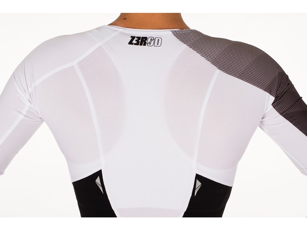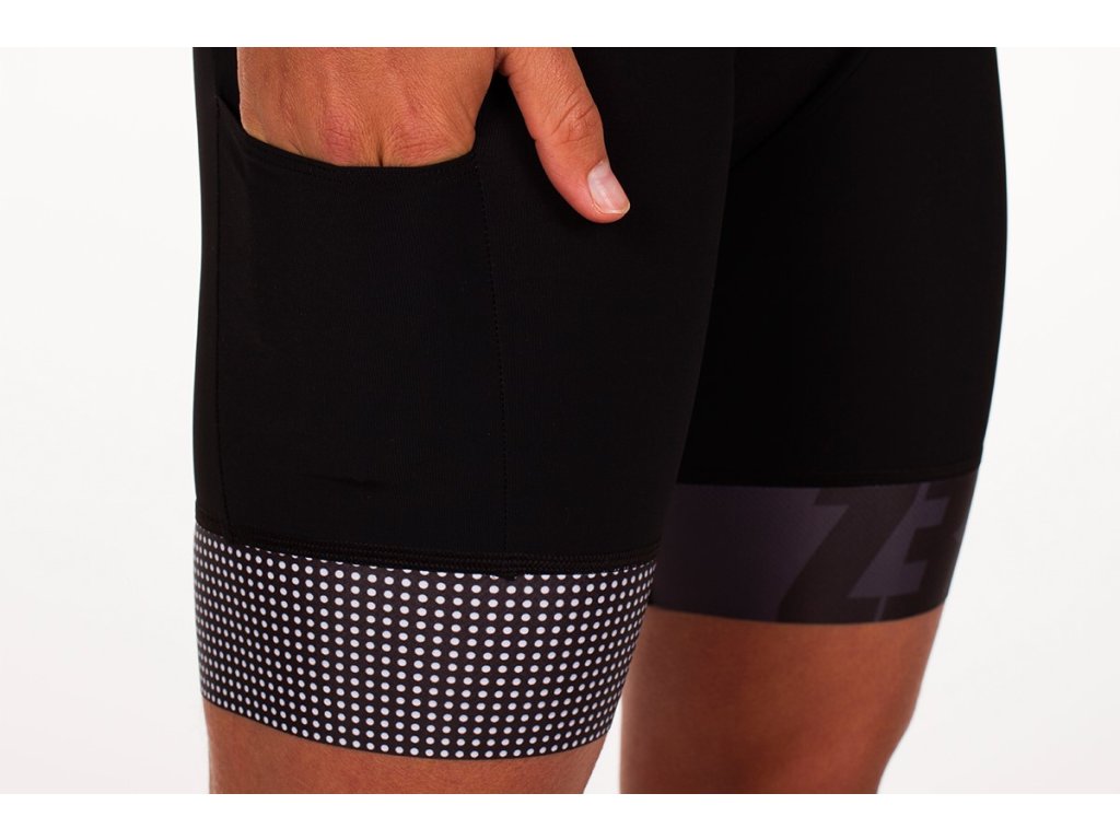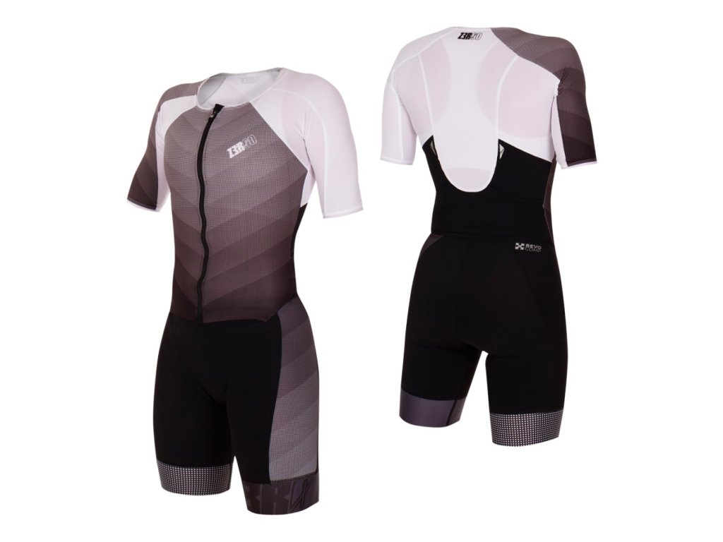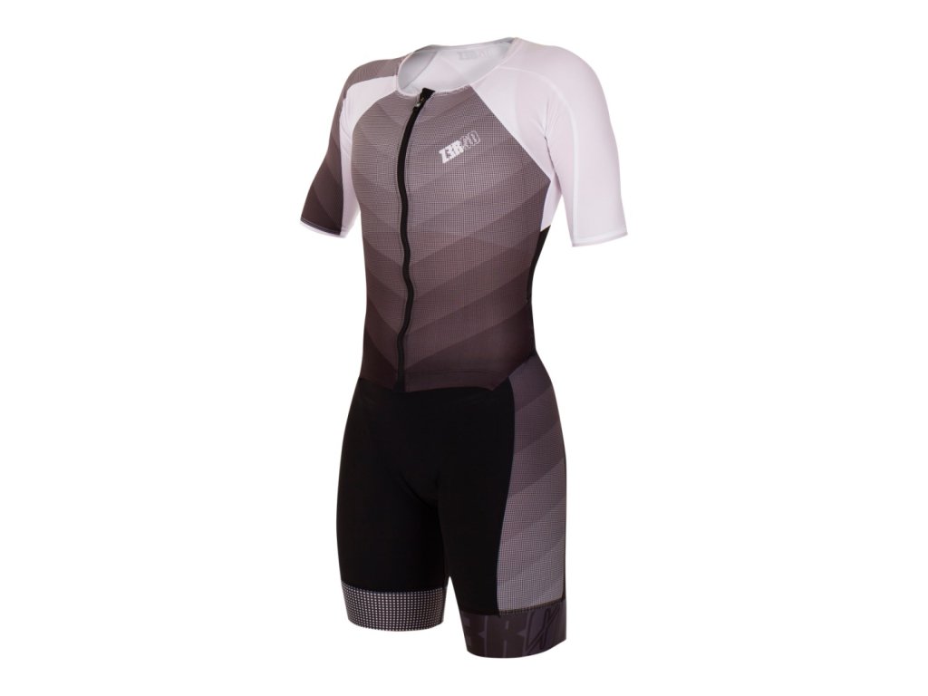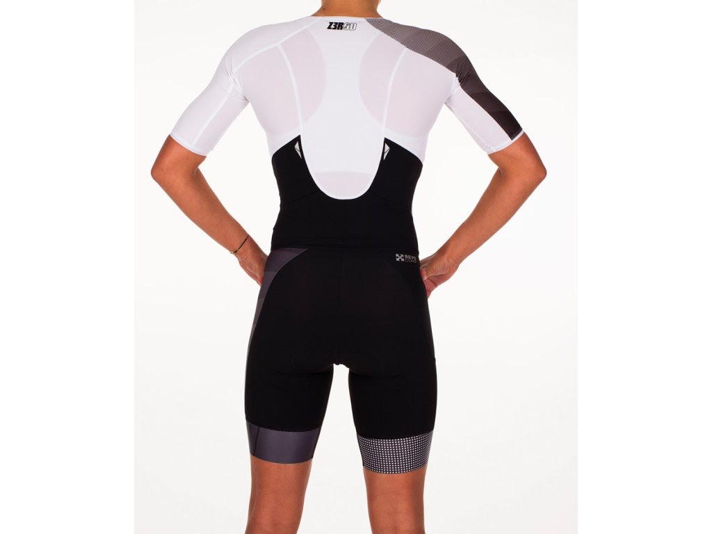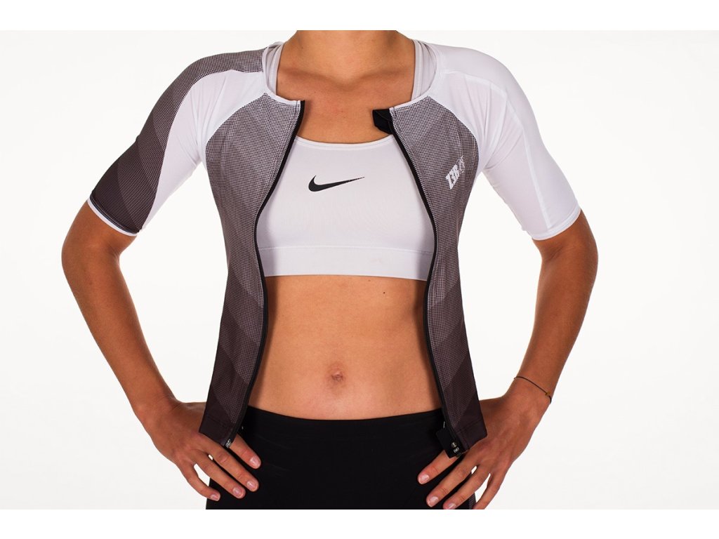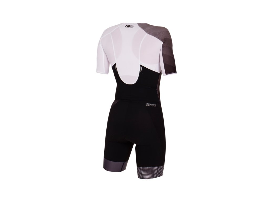 Dámská triatlonová kombinéza s krátkým rukávem. Dres TTSUIT řady Racer byl navržen pro triatlonistky závodící na delších vzdálenostech. Svršek byl navržen ve vestovém stylu, což spolu s ultralehkou a elastickou tkaninou znatelně ulehčuje oblékání a svlékání dresu. Zip a grip na spodním lemu navíc zajistí, že dres zůstane na správném místě po celou dobu závodu. Dres je vhodný pro podávání těch nejvyšších triatlonových výkonů. Byl speciálně navržen pro zvýšení aerodynamické efektivity, což pocítíte především při závodě. Svršek disponuje krátkým rukávem překrývajícím biceps, čímž ho chrání před vnějšími vlivy jako je déšť nebo vítr. Přidáním rukávu je navíc dosaženo daleko lepší aerodynamiky v porovnání s nahou kůží, což zajisté oceníte v cyklistické části triatlonu. V oblasti ramenou a paží je dres vyroben z tkaniny Ultra Light Skin, která zajišťuje pohodlí, zatímco materiál Dry Tech Mesh na zádech dokonale odvádí pot, ventiluje a udržuje kůži v suchu a teple. Nová technologie Revo Comp poskytuje nohám perfektní svalovou podporu a maximální volnost pohybu. Díky anatomicky střiženým panelům na bocích dres velmi dobře padne. Dvě anatomicky střižené kapsy v zadní části dresu Vám umožní si sebou vzít energetické doplňky a zároveň nenaruší Vaši aerodynamiku. Technické parametry: - 40cm zip pro ultra rychlé oblékání a lepší pohyblivost. Dvojité šití z vnitřní strany zaručuje maximální odolnost a pohodlí, nechybí ani funkce stop-lock, díky které zůstane jezdec ve Vámi nastavené pozici; - jemný lem okolo krku a rukávů pro zlepšení aerodynamiky a maximální komfort; - silikonový lem na nohavicích udrží dres na správném místě při cyklistické části závodu; - ochrana proti slunci díky tkanině Water Wear Weapon: UPF50+; - semišový ženský tripad s gelem uvnitř je rychleschnoucí, extrémně elastický, antibakteriální a zároveň velmi efektivní pro jízdu na kole a pohodlný při běhu. Složení: 80 % polyamid, 20 % elastan. Vyrobeno v Portugalsku. TABULKA VELIKOSTÍDoplňkové parametry