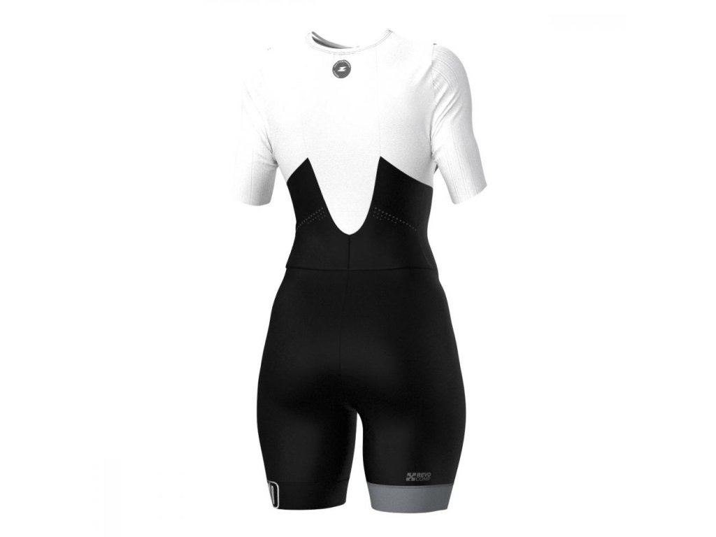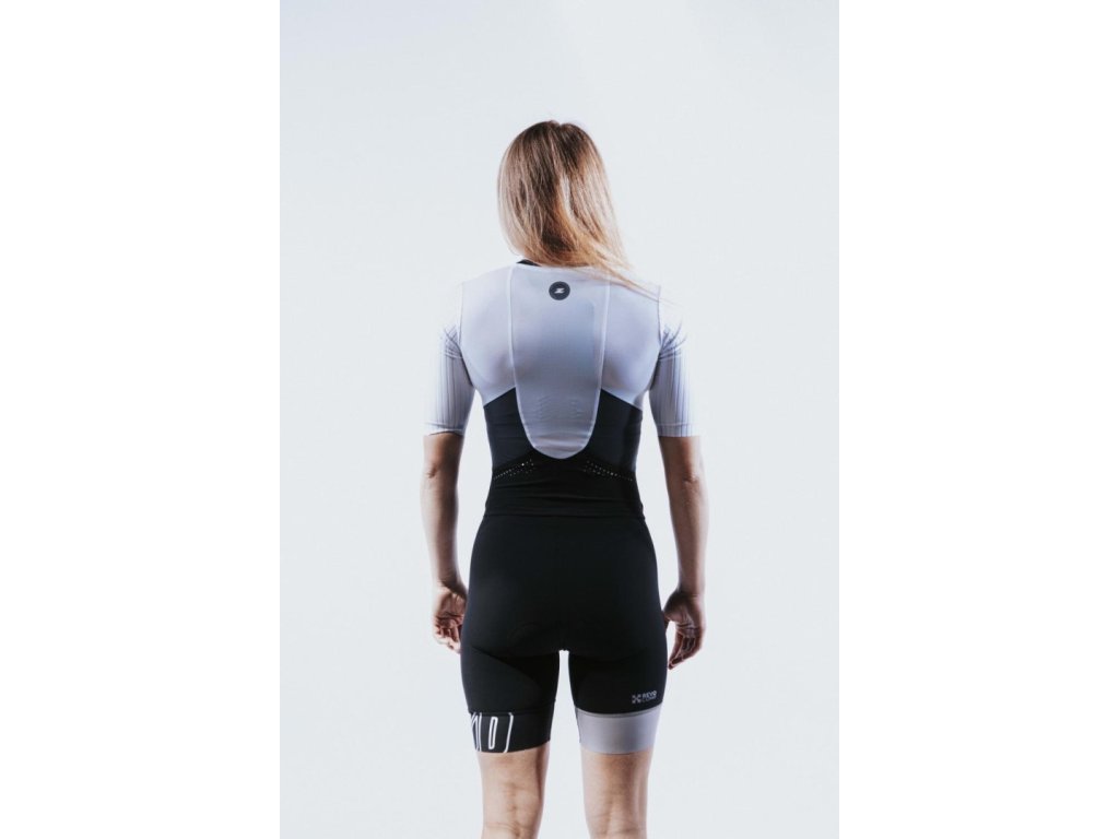 Dámská triatlonová kombinéza s krátkým rukávem. Dres TTSUIT řady Racer byl navržen pro triatlonistky závodící na delších vzdálenostech. Svršek byl navržen ve vestovém stylu, což, spolu s ultralehkou a elastickou tkaninou, znatelně ulehčuje oblékání a svlékání dresu. Zip a grip na spodním lemu navíc zajistí, že dres zůstane na správném místě po celou dobu závodu. Dres je vhodný pro podávání těch nejvyšších triatlonových výkonů. Byl speciálně navržen pro zvýšení aerodynamické efektivity, což pocítíte především při závodě. Svršek disponuje krátkým rukávem překrývajícím biceps, čímž ho chrání před vnějšími vlivy jako je déšť nebo vítr. Přidáním rukávu je navíc dosaženo daleko lepší aerodynamiky v porovnání s nahou kůži, což zajisté oceníte v cyklistické části triatlonu. V oblasti ramenou a paží je dres vyroben z tkaniny Ultra Light Skin, která zajišťuje pohodlí, zatímco materiál Dry Tech Mesh na zádech dokonale odvádí pot, ventiluje a udržuje kůži v suchu a teple. Nová technologie Revo Comp poskytuje nohám perfektní svalovou podporu a maximální volnost pohybu. Díky anatomicky střiženým panelům na bocích dres velmi dobře padne. Dvě anatomicky střižené kapsy v zadní části dresu Vám umožní si sebou vzít energetické doplňky a zároveň nenaruší Vaši aerodynamiku. Technické parametry: - 40cm zip pro ultra rychlé oblékání a lepší pohyblivost. Dvojité šití z vnitřní strany zaručuje maximální odolnost a pohodlí, nechybí ani funkce stop-lock, díky které zůstane jezdec ve Vámi nastavené pozici; - jemný lem okolo krku a rukávů pro zlepšení aerodynamiky a maximální komfort; - silikonový lem na nohavicích udrží dres na správném místě při cyklistické části závodu; - ochrana proti slunci díky tkanině Water Wear Weapon: UPF50+; - semišový ženský tripad s gelem uvnitř je rychleschnoucí, extrémně elastický, antibakteriální a zároveň velmi efektivní pro jízdu na kole a pohodlný při běhu. Složení: 80 % polyamid, 20 % elastan. Vyrobeno v Portugalsku. TABULKA VELIKOSTÍDoplňkové parametry