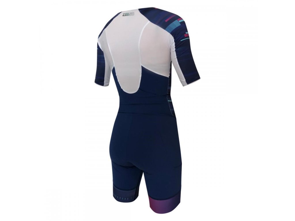 Dámská triatlonová kombinéza s krátkým rukávem Dres TTSUIT řady Racer byl navržen pro triatlonistky závodící na delších vzdálenostech. Svršek byl navržen ve vestovém stylu, což spolu s ultralehkou a elastickou tkaninou znatelně ulehčuje oblékání a svlékání dresu. Zip a grip na spodním lemu navíc zajistí, že dres zůstane na správném místě po celou dobu závodu. Dres je vhodný pro podávání těch nejvyšších triatlonových výkonů. Byl speciálně navržen pro zvýšení aerodynamické efektivity, což pocítíte především při závodě. Svršek disponuje krátkým rukávem překrývajícím biceps, čímž ho chrání před vnějšími vlivy jako je déšť nebo vítr. Přidáním rukávu je navíc dosaženo daleko lepší aerodynamiky v porovnání s nahou kůží, což zajisté oceníte v cyklistické části triatlonu. V oblasti ramenou a paží je dres vyroben z tkaniny Ultra Light Skin, která zajišťuje pohodlí, zatímco materiál Dry Tech Mesh na zádech dokonale odvádí pot, ventiluje a udržuje kůži v suchu a teple. Nová technologie Revo Comp poskytuje nohám perfektní svalovou podporu a maximální volnost pohybu. Díky anatomicky střiženým panelům na bocích dres velmi dobře padne. Dvě anatomicky střižené kapsy v zadní části dresu Vám umožní si sebou vzít energetické doplňky a zároveň nenaruší Vaši aerodynamiku. Technické parametry: - 40cm zip pro ultra rychlé oblékání a lepší pohyblivost. Dvojité šití z vnitřní strany zaručuje maximální odolnost a pohodlí, nechybí ani funkce stop-lock, díky které zůstane jezdec ve Vámi nastavené pozici; - jemný lem okolo krku a rukávů pro zlepšení aerodynamiky a maximální komfort; - silikonový lem na nohavicích udrží dres na správném místě při cyklistické části závodu; - ochrana proti slunci díky tkanině Water Wear Weapon: UPF50+; - semišový ženský tripad s gelem uvnitř je rychleschnoucí, extrémně elastický, antibakteriální a zároveň velmi efektivní pro jízdu na kole a pohodlný při běhu. Složení: 80 % polyamid, 20 % elastan. Vyrobeno v Portugalsku. TABULKA VELIKOSTÍDoplňkové parametry