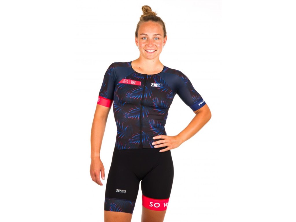 Dámská triatlonová kombinéza s krátkým rukávem. Dres TTSUIT řady Racer byl navržen pro triatlonistky závodící na delších vzdálenostech. Svršek byl navržen ve vestovém stylu, což, spolu s ultralehkou a elastickou tkaninou, znatelně ulehčuje oblékání a svlékání dresu. Zip a grip na spodním lemu navíc zajistí, že dres zůstane na správném místě po celou dobu závodu. Dres je vhodný pro podávání těch nejvyšších triatlonových výkonů. Byl speciálně navržen pro zvýšení aerodynamické efektivity, což pocítíte především při závodě. Svršek disponuje krátkým rukávem překrývajícím biceps, čímž ho chrání před vnějšími vlivy jako je déšť nebo vítr. Přidáním rukávu je navíc dosaženo daleko lepší aerodynamiky v porovnání s nahou kůži, což zajisté oceníte v cyklistické části triatlonu. V oblasti ramenou a paží je dres vyroben z tkaniny Ultra Light Skin, která zajišťuje pohodlí, zatímco materiál Dry Tech Mesh na zádech dokonale odvádí pot, ventiluje a udržuje kůži v suchu a teple. Nová technologie Revo Comp poskytuje nohám perfektní svalovou podporu a maximální volnost pohybu. Díky anatomicky střiženým panelům na bocích dres velmi dobře padne. Dvě anatomicky střižené kapsy v zadní části dresu Vám umožní si sebou vzít energetické doplňky a zároveň nenaruší Vaši aerodynamiku. Technické parametry: - 40cm zip pro ultra rychlé oblékání a lepší pohyblivost. Dvojité šití z vnitřní strany zaručuje maximální odolnost a pohodlí, nechybí ani funkce stop-lock, díky které zůstane jezdec ve Vámi nastavené pozici; - jemný lem okolo krku a rukávů pro zlepšení aerodynamiky a maximální komfort; - silikonový lem na nohavicích udrží dres na správném místě při cyklistické části závodu; - ochrana proti slunci díky tkanině Water Wear Weapon: UPF50+; - semišový ženský tripad s gelem uvnitř je rychleschnoucí, extrémně elastický, antibakteriální a zároveň velmi efektivní pro jízdu na kole a pohodlný při běhu. Složení: 80 % polyamid, 20 % elastan. Vyrobeno v Portugalsku. TABULKA VELIKOSTÍDoplňkové parametry